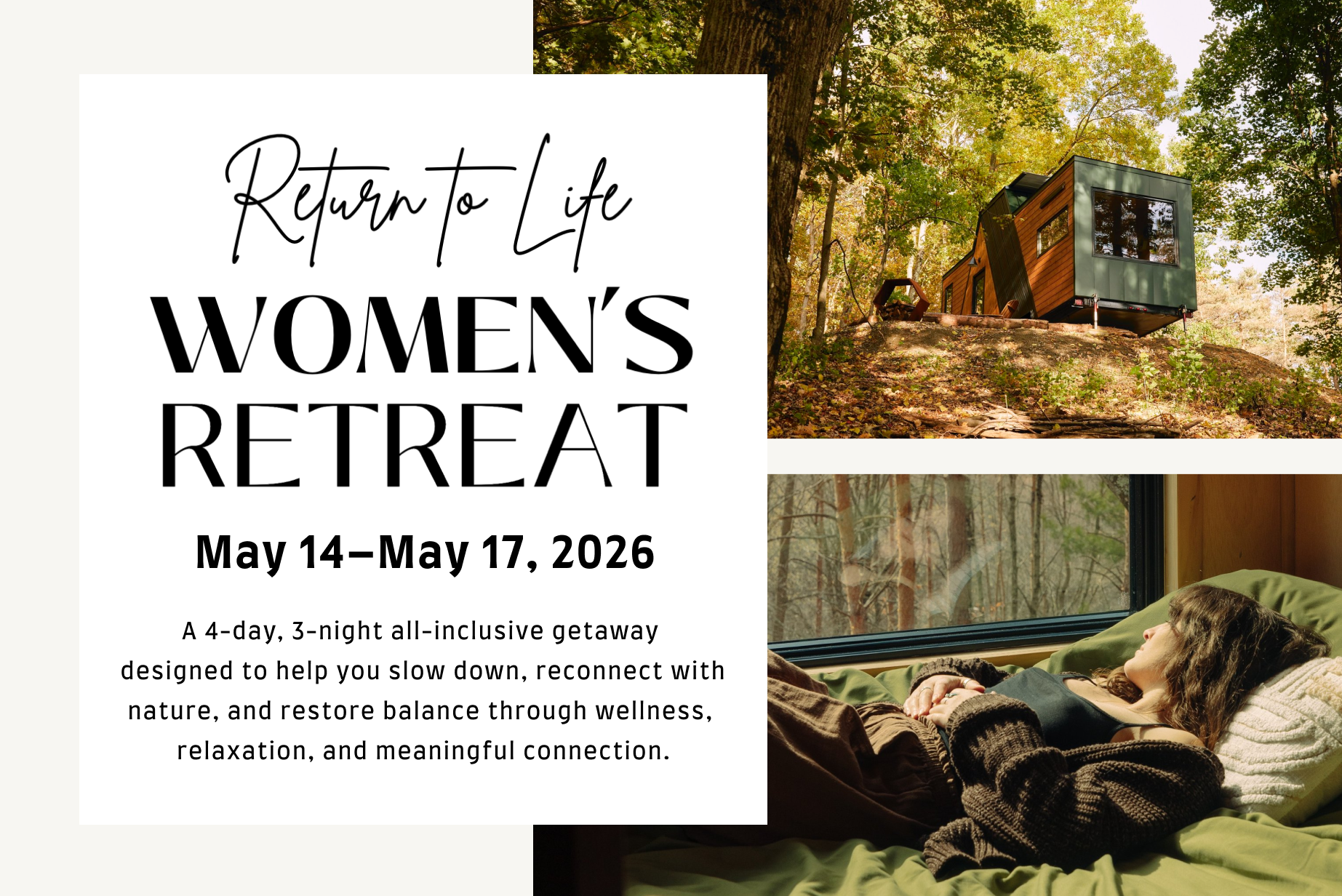 All‑inclusive accommodation Seasonal, detoxifying meals and fresh juices Daily yoga, Pilates, and mindful movement sessions Guided sound bath experiences Vibroacoustic therapy sessions One or more massage sessions (depending on length of stay) Access to the Nordic outdoor spa (sauna, cold plunge, infrared & red‑light therapy, halo therapy, aromatherapy) Group nature hike Evening bonfire ceremony Spring Equinox intention setting & closing integration